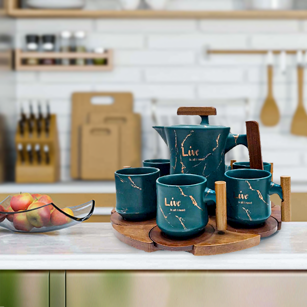 يجمع هذا الطقم بين التصميم العصري المستوحى من نقش الماربل الفاخر والصينية الخشبية الأنيقة التي تضفي لمسة طبيعية دافئة على تقديم القهوة.