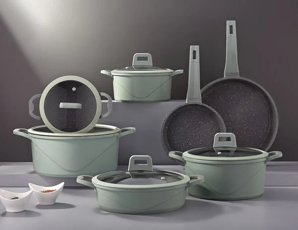 يتميز الطقم بطلاء جرانيت صحي مقاوم للالتصاق، مما يسهل الطهي والتنظيف ويحافظ على الطعام صحيًا دون استخدام الكثير من الزيوت. كما يضمن التوزيع الحراري المتساوي نتائج طهي مثالية في كل مرة، سواء للطواجن، الشوربة، أو الأكلات اليومية.