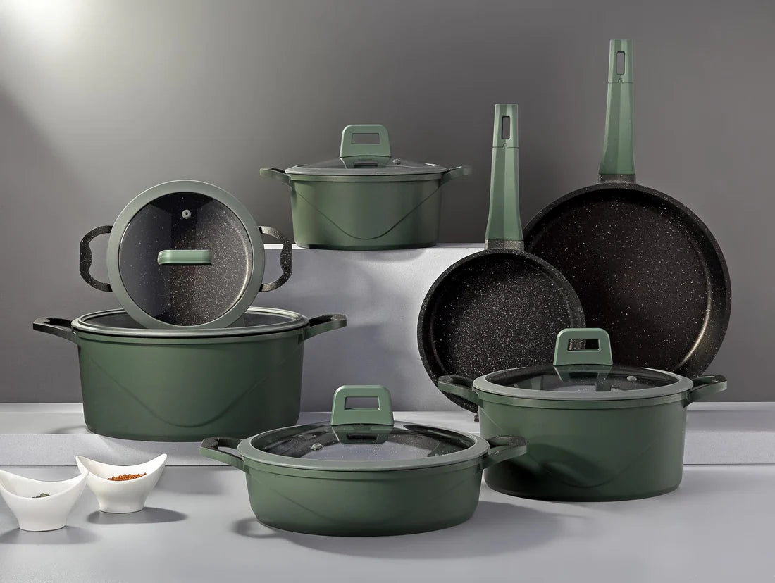 امنحي مطبخك لمسة من الفخامة والعملية مع طقم أواني الطهي جرانيت روبي من فيفالدي – 12 قطعة.